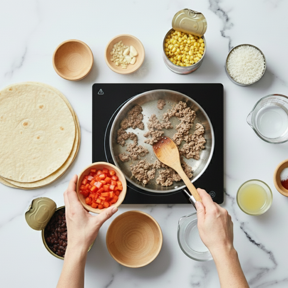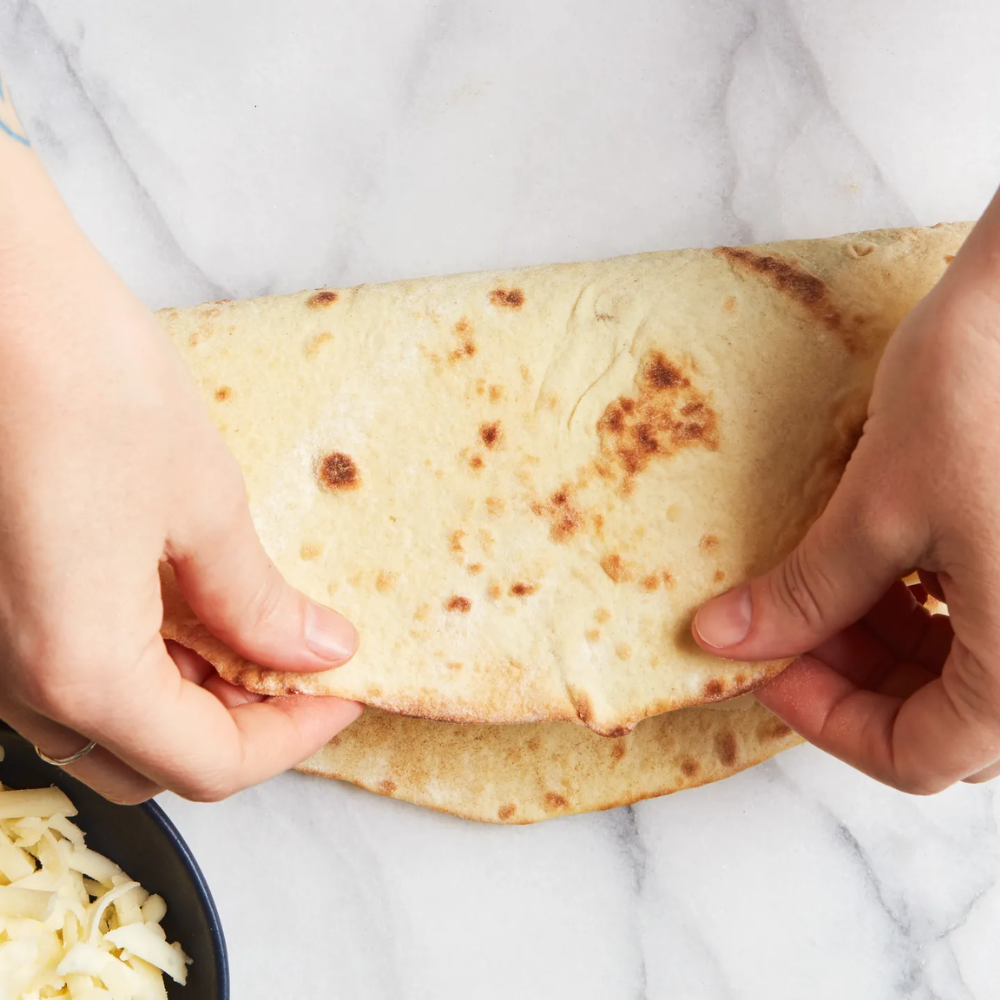Verwarm de tortilla’s kort in een droge pan (10–20 seconden per kant).