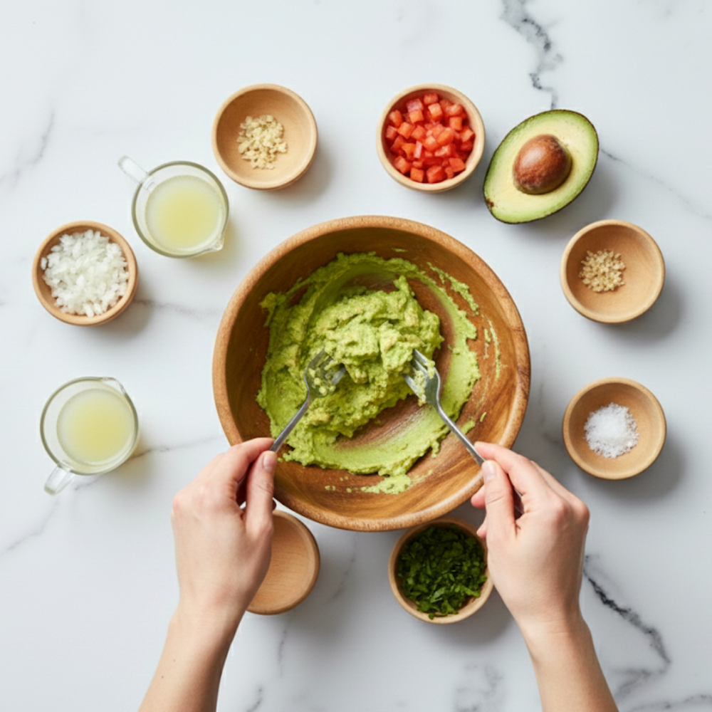 Halveer de avocado’s en prak het vruchtvlees in een kom.