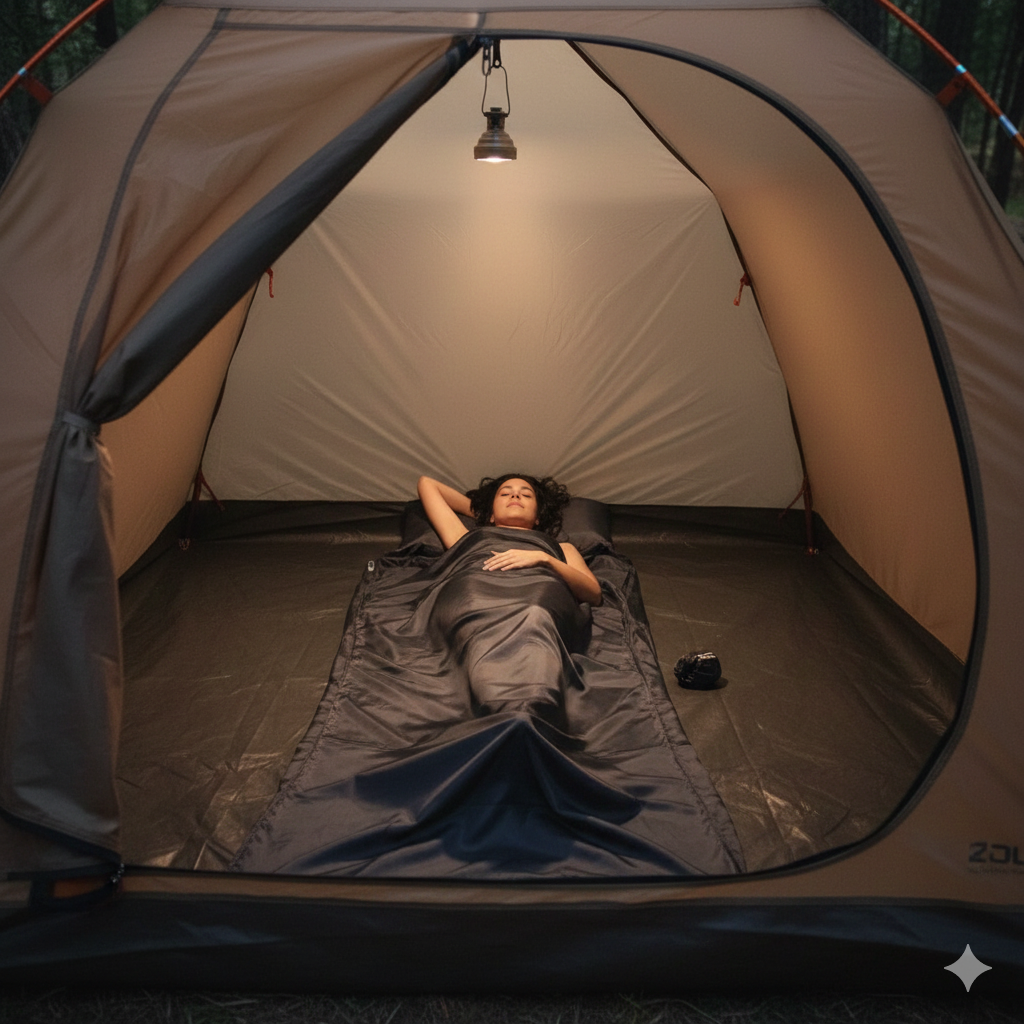 De rechthoekige vorm van de lakenzak met zijdelingse klittenbandsluiting maakt het eenvoudig om in- en uit te stappen. Er is een geïntegreerd vakje voor je kussen, zodat deze niet wegglijdt tijdens het slapen. De naden zijn dubbel gestikt en versterkt op kritieke punten, wat bijdraagt aan duurzaamheid en langdurig gebruik.