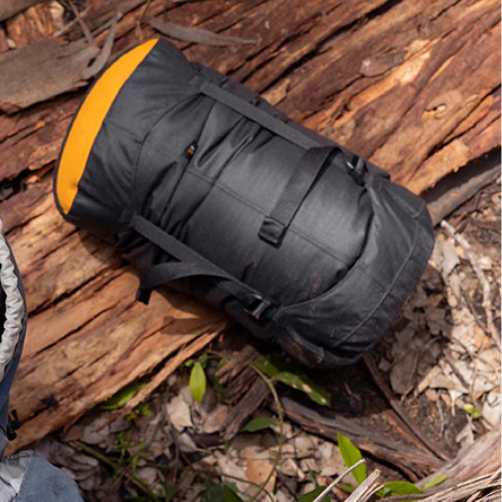 Het compressiesysteem bestaat uit drie riemen, voorzien van twee ladderlock-gespen en één side-release gesp. Deze configuratie maakt snelle toegang tot de inhoud mogelijk, verlaagt het totale gewicht en zorgt voor een gelijkmatige compressie zonder opbollen. De vaste flip-top sluiting voorkomt dat de riemen in de knoop raken tijdens het inpakken.
