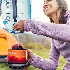 De veelzijdigheid van dit product komt echt tot zijn recht wanneer je aankomt op je bestemming. Het systeem wordt geleverd met een geïntegreerde ophanglus en een verwisselbare 'Basecamp Tap'. Dankzij de snelkoppeling in de slang klik je het drinkslangetje eenvoudig los en bevestig je de tap. Hiermee creëer je direct een hangend watersysteem met een handige drukknop. Dit maakt het vullen van pannen, het wassen van handen of het vullen van drinkflessen in het kamp ontzettend eenvoudig, zonder dat je met losse flessen hoeft te hannesen.