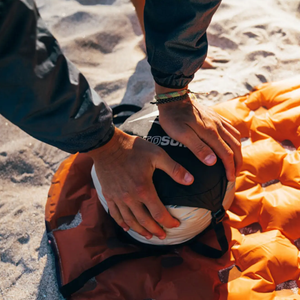 Het compressiesysteem bestaat uit drie riemen, voorzien van twee ladderlock-gespen en één side-release gesp. Deze configuratie maakt snelle toegang tot de inhoud mogelijk, verlaagt het totale gewicht en zorgt voor een gelijkmatige compressie zonder opbollen. De vaste flip-top sluiting voorkomt dat de riemen in de knoop raken tijdens het inpakken.