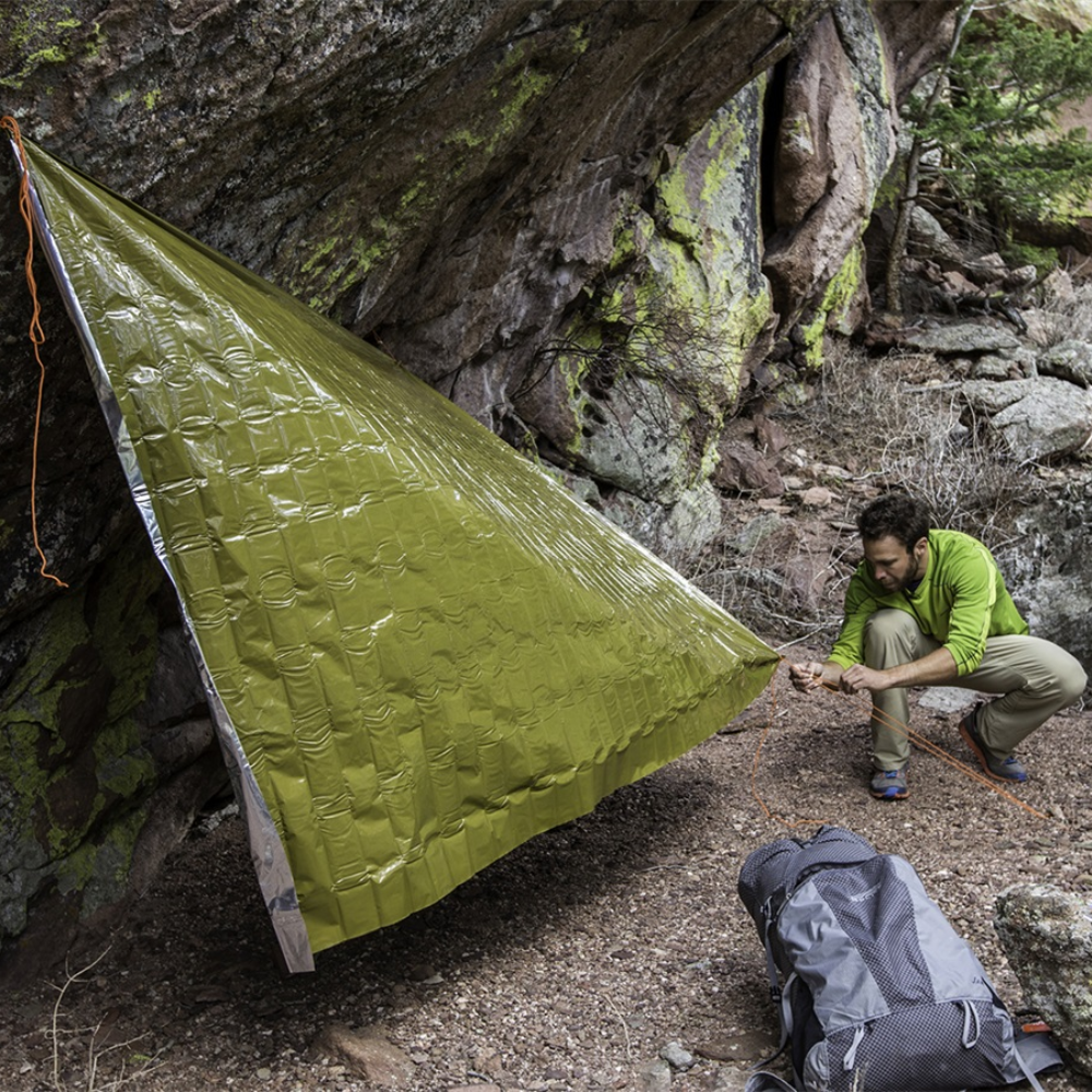Juist omdat je buiten vaak moet improviseren, is dit type emergency blanket zo handig. Gebruik ’m bijvoorbeeld: